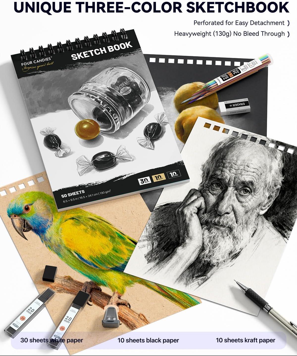 【Tri-Color Sketchbook for Creating Vibrant Artwork】This 6.5-inch x 9.5-inch sketchbook includes 30 sheets of white paper, 10 sheets of kraft paper, and 10 sheets of black paper—generously sized and extra-thick, with each sheet weighing 130g for lasting durability and minimal ink bleed. The top-bound spiral binding allows easy page-turning and neat tear-outs. The three paper tones provide ideal surfaces for dynamic shading, highlighting, and contrast effects, helping artists experiment with different styles and add depth to every sketch.