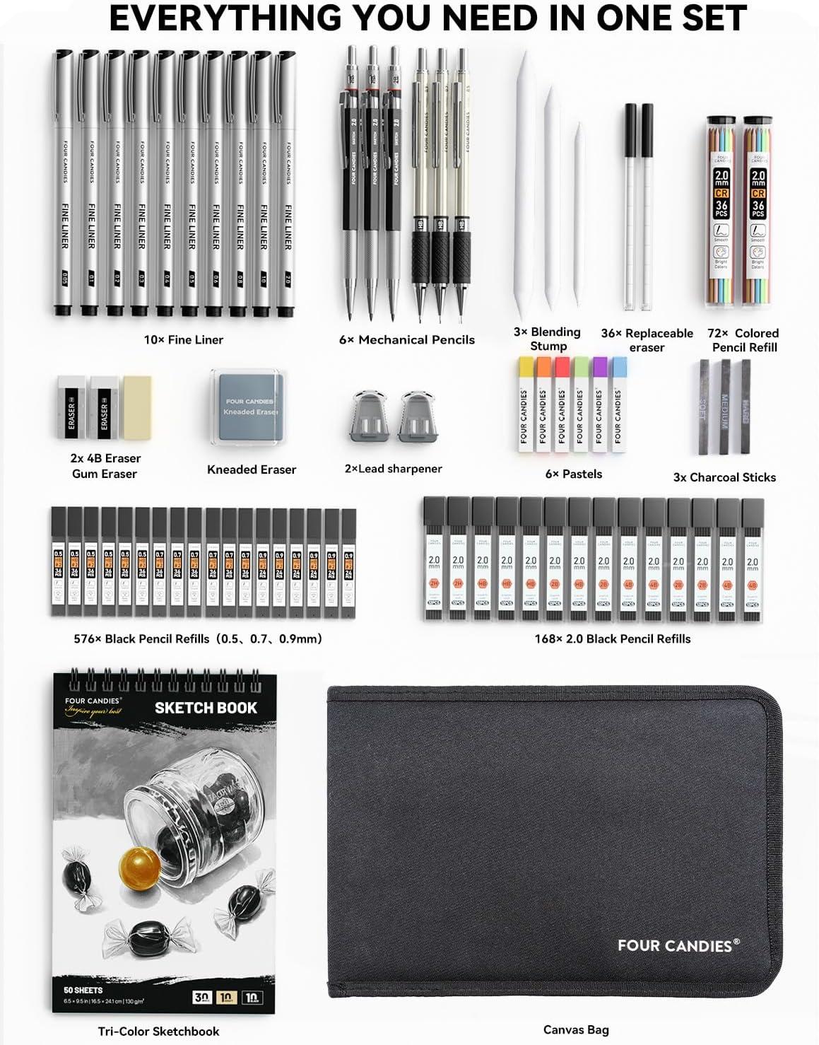 【Professional Sketching & Drawing Set – Advanced Edition】This advanced art supplies toolkit is a comprehensive upgrade for professional artists. Building upon the standard drawing set, it adds charcoal sticks, soft pastels, ample leads, and fine drawing tools for complex works. This complete sketch kit includes all essentials—10 fineliners, 6 mechanical pencils, a tri-color sketchbook—plus upgrade parts: 744 graphite leads (0.5/0.7/0.9/2.0mm), 72 colored pencil refills,72 erasers, 3 charcoal sticks, 6 soft pastels, and 3 blending stumps. Housed in a durable canvas case, this professional drawing kit is your all-in-one solution for detailed illustrations to expressive mixed-media art.