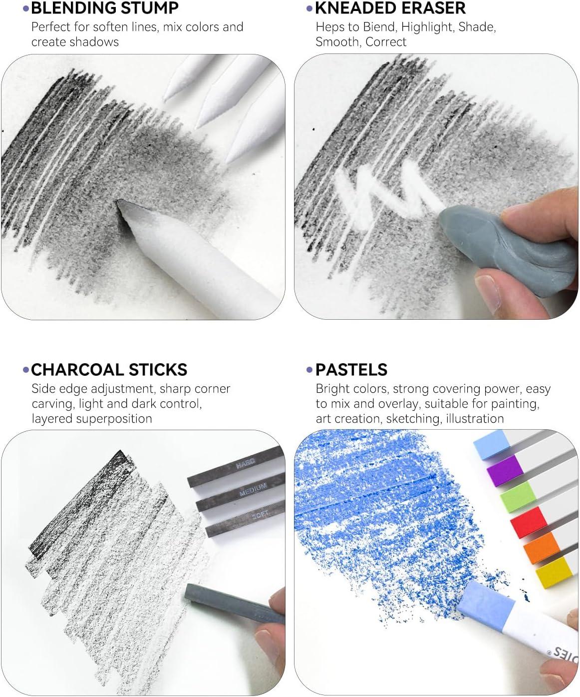 【New Professional Art Supplies & Accessories】This updated art set includes 3 new professional charcoal pencils and 6 soft pastels, creating a wide range of tones from deep darks to rich grays, making it ideal for portraiture, figure drawing, and conceptual art.The art kit also includes 3 blending stumps for smoothly mixing charcoal and pastel strokes, enabling seamless gradients and realistic shading. The upgraded eraser system includes 72 eraser refills and 12 white 4B erasers, covering everything from fine corrections to large-area erasing.