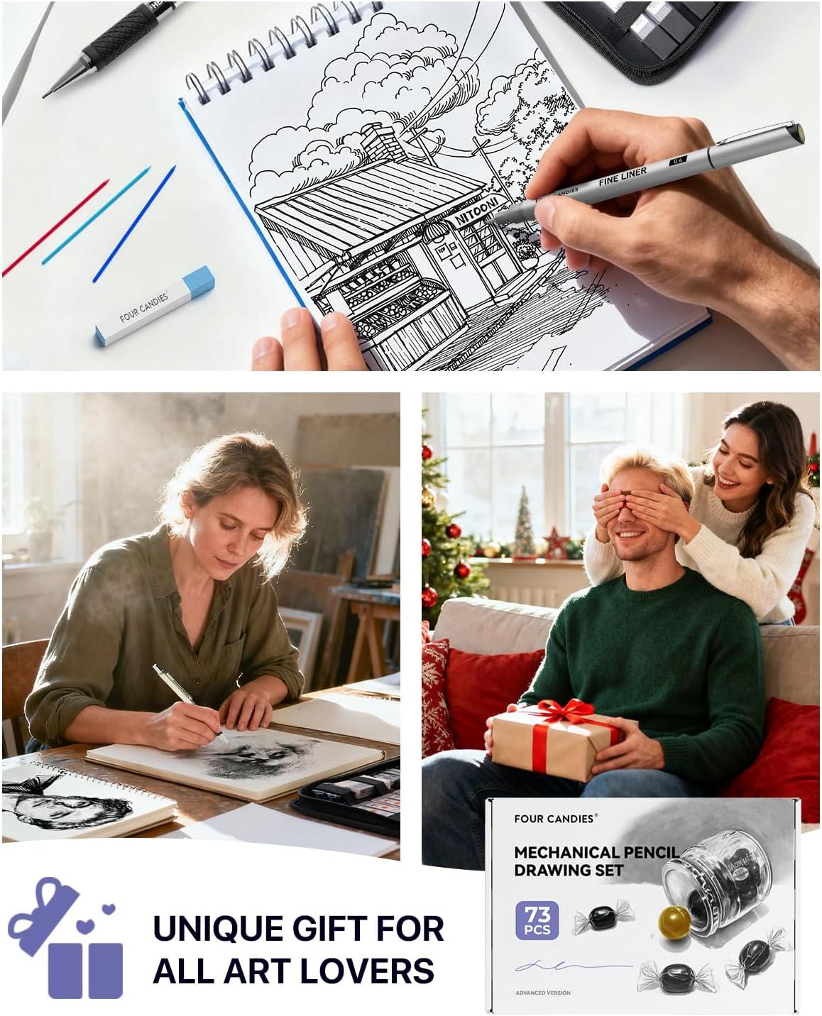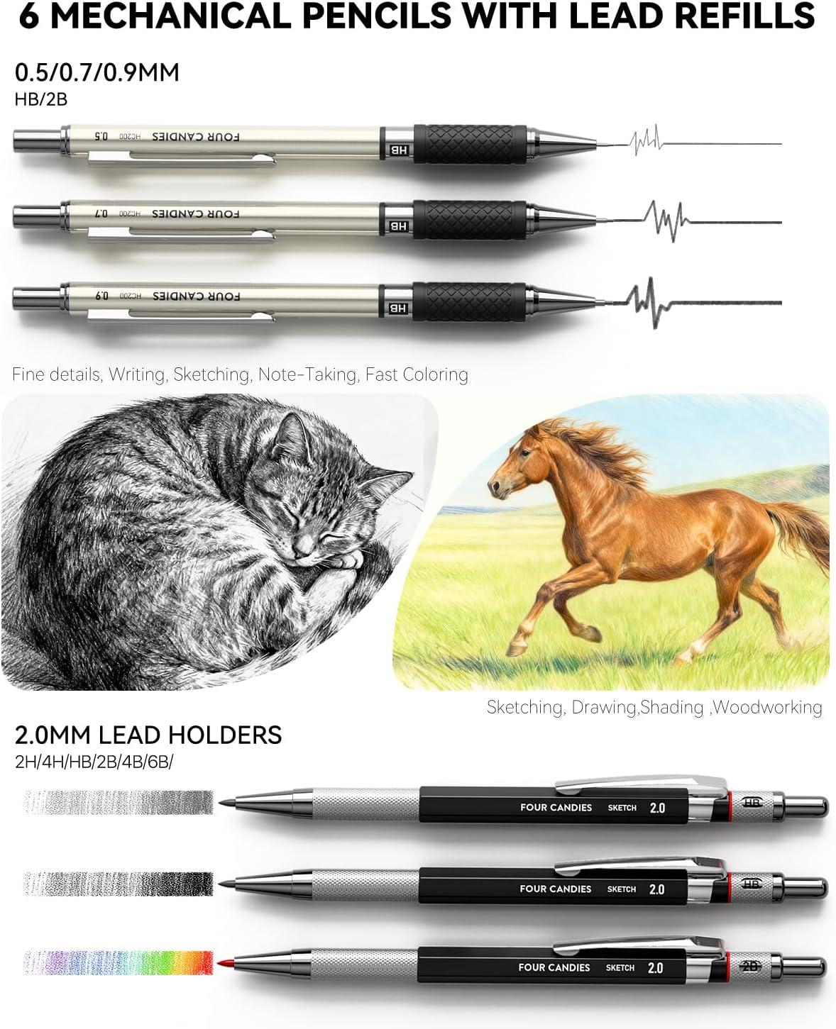【6 Mechanical Pencils & Upgraded Refill Collection】This advanced drawing kit includes 6 drawing mechanical pencils and a professional-level supply of refills. It covers a range of lead sizes including 0.5mm, 0.7mm, 0.9mm, and 2.0mm in various hardness grades. The total number of 0.5/0.7/0.9mm graphite refills has been upgraded to 576, 168pcs 2.0mm graphite refills plus 72 colored pencil leads. Engineered to be break-resistant and smooth-writing, these refills allow for seamless shading, precise lines, and consistent artwork—no sharpening required, making this drawing pencils set an essential art kit for artists.