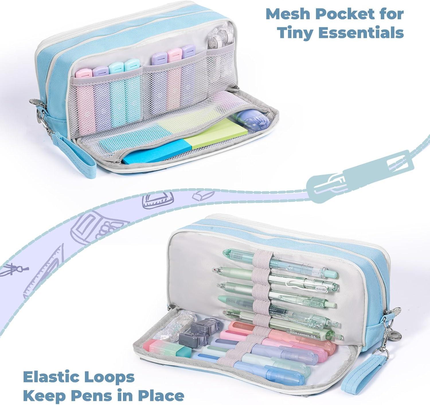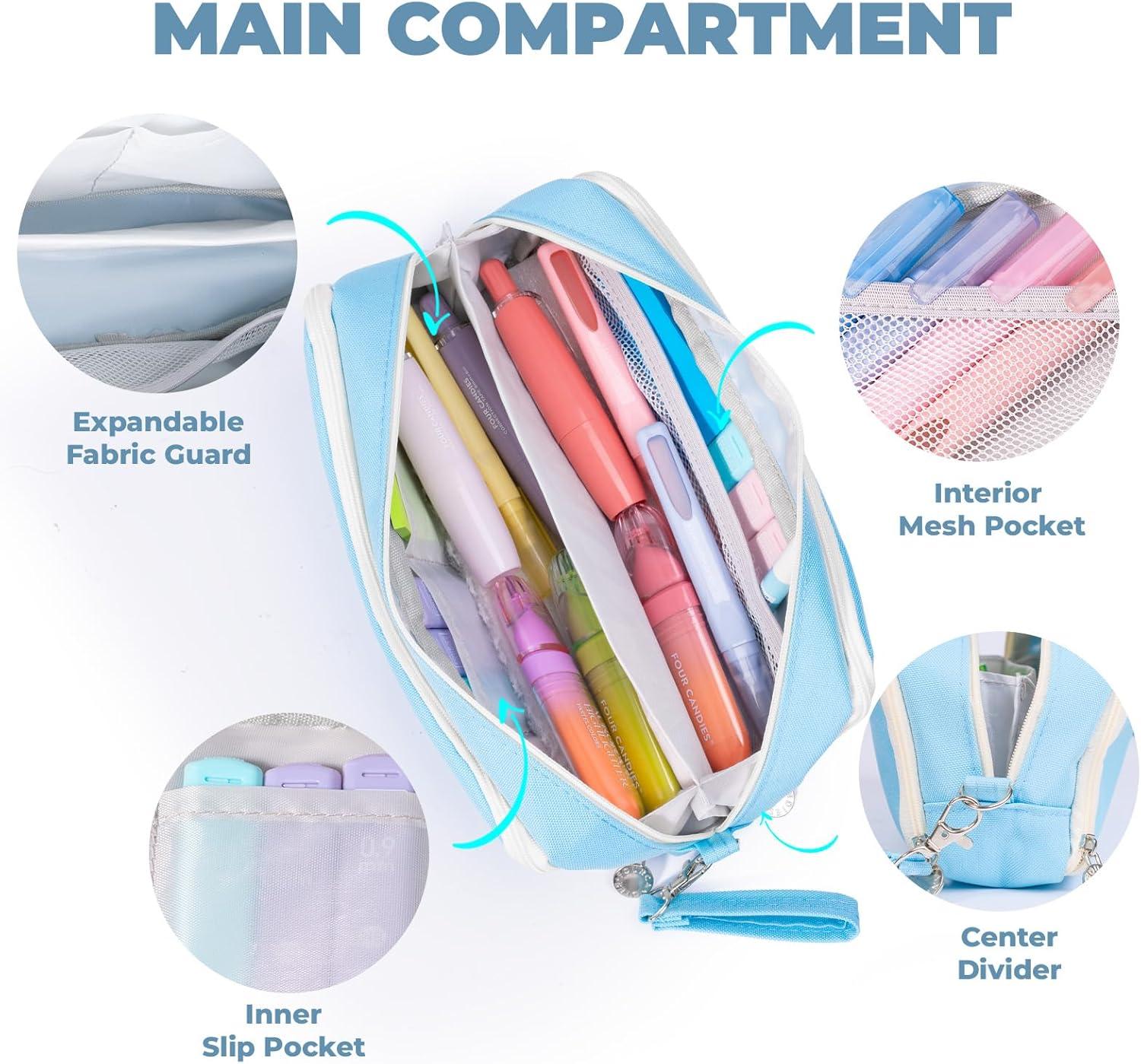 Multifunctional Main Compartment: The center layer of this pencil bag includes a mesh pocket for quick access and 3 slip pockets for small items. A flexible divider creates 2 zones to improve organization. The wide-opening design allows quick visibility and easy access to all contents